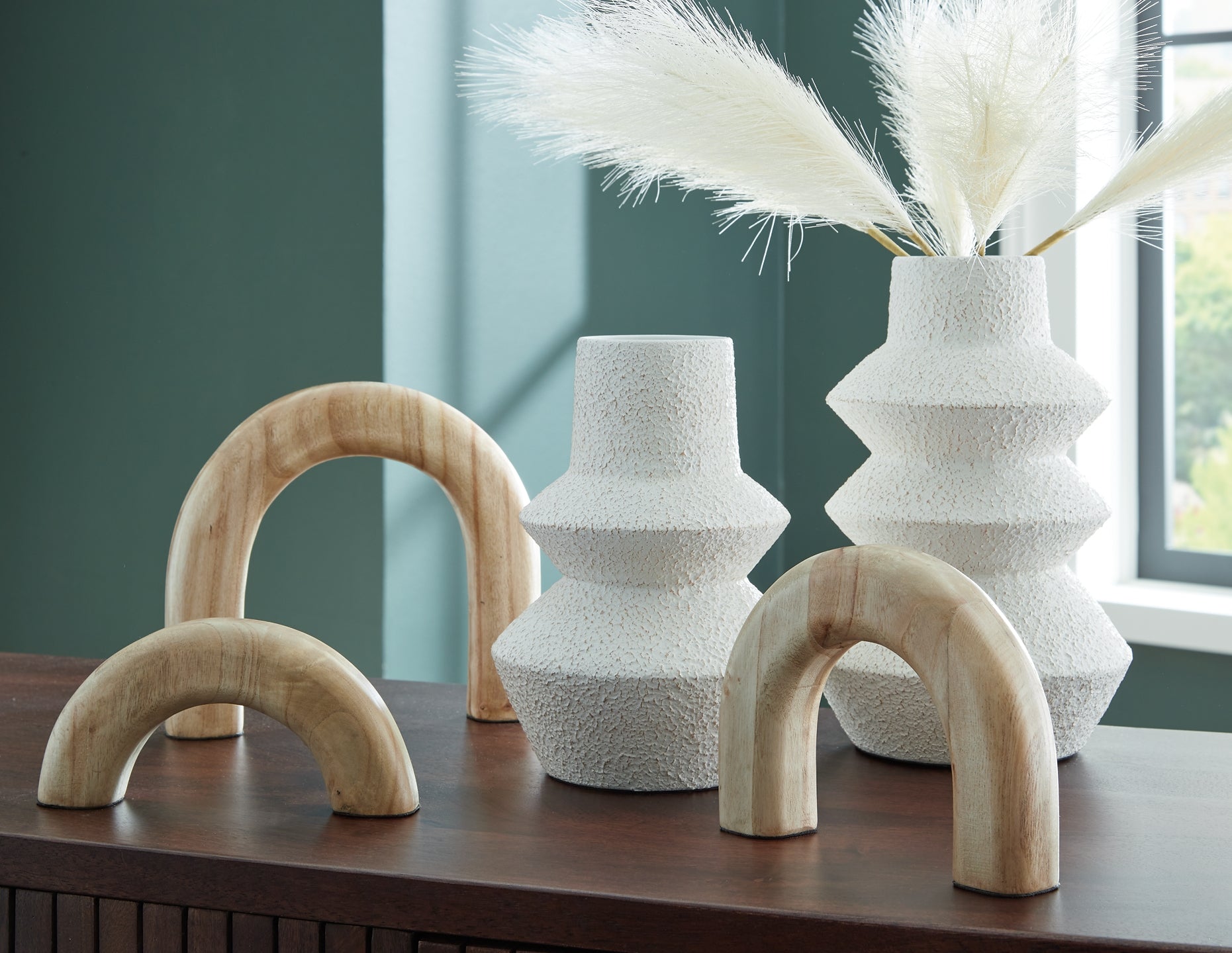 Craft a contemporary haven with the delightfully neutral tones and modern forms of this accessory set. Its sculptures, with their seamlessly streamlined arch designs, can be displayed together or stand solo as subtle statement pieces. The tiered look of the eye-catching vases adds that much more geometric interest.